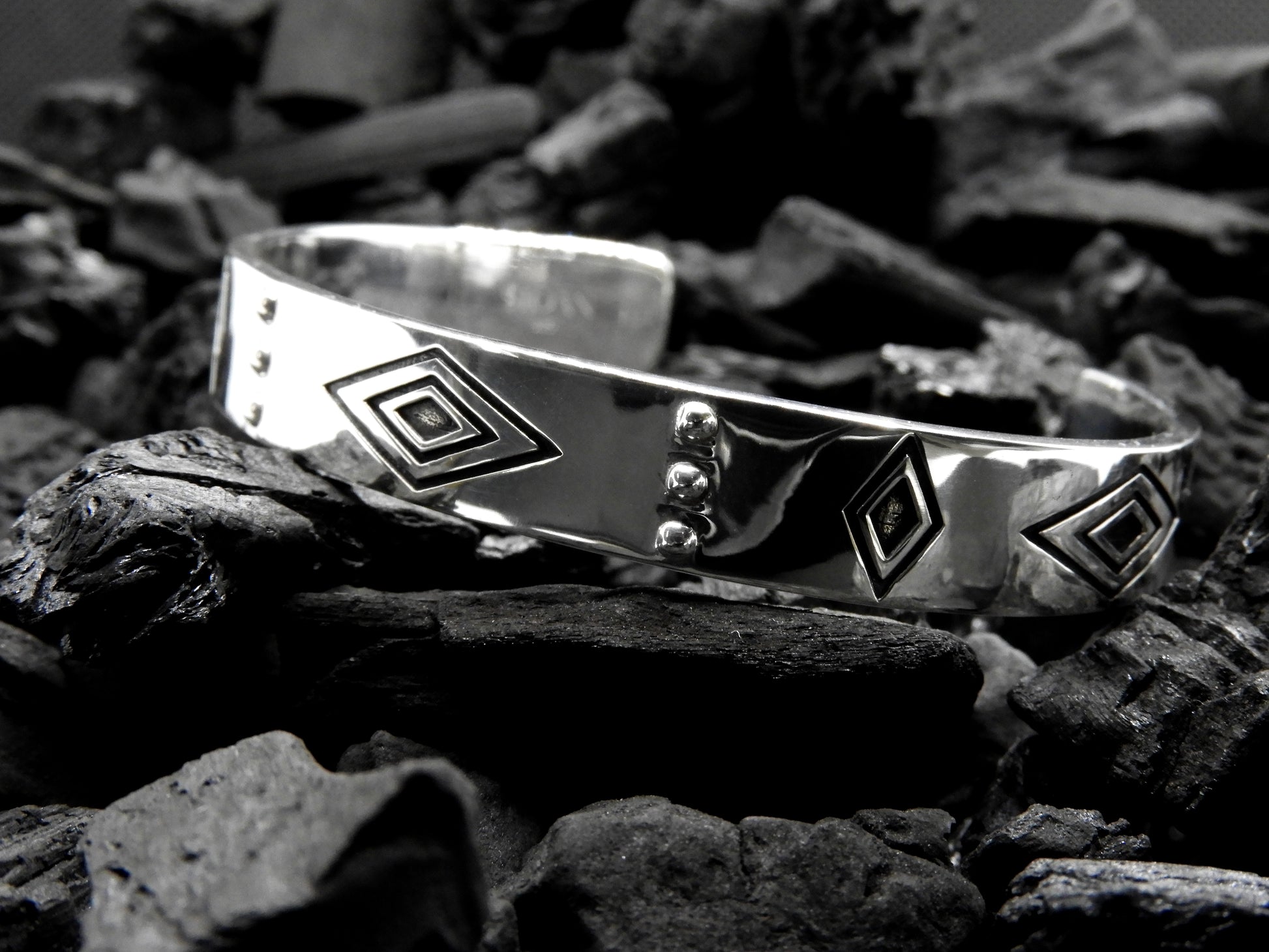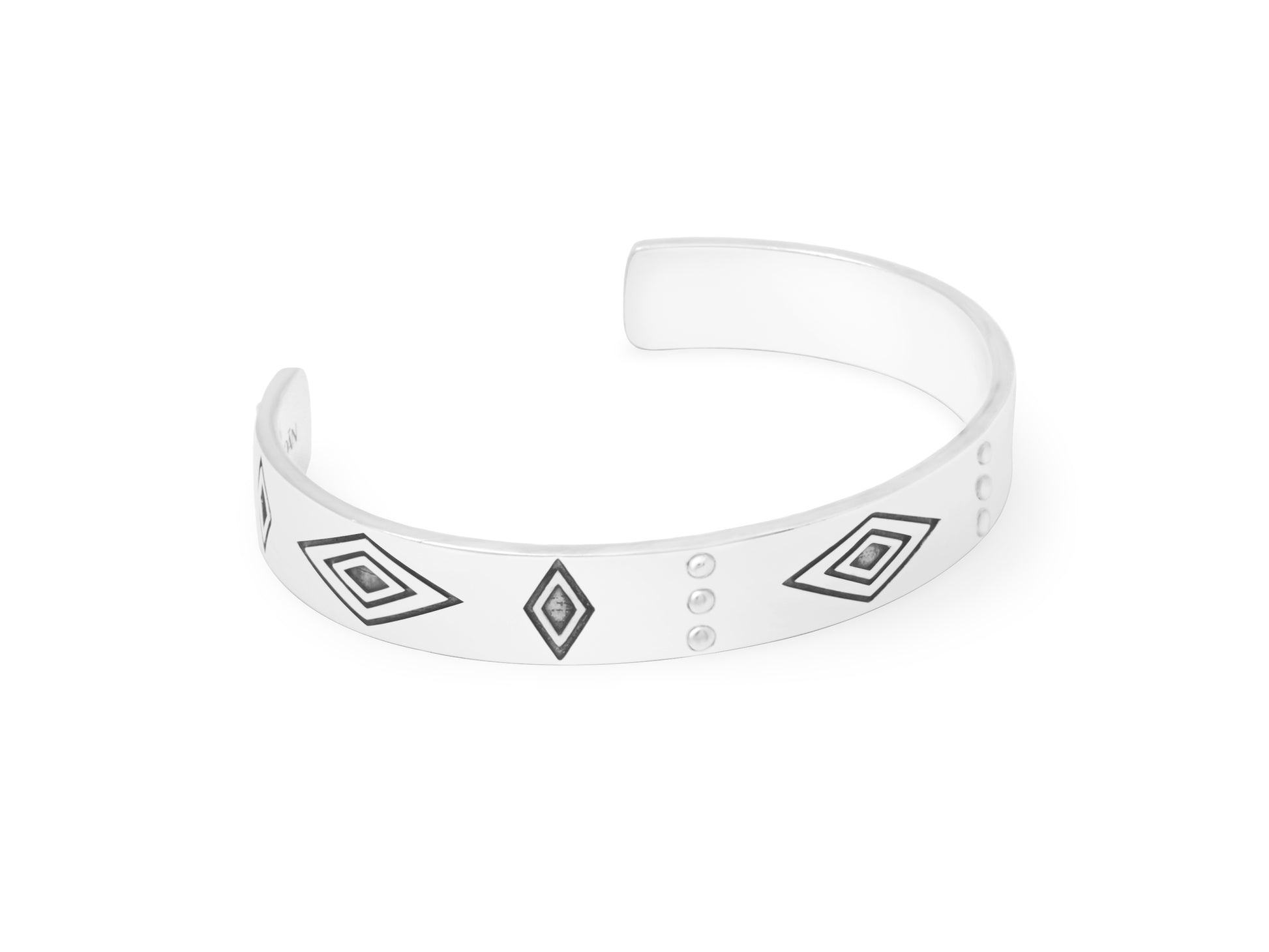 Cuffs are not designed to be stretched or tightened. Avoid stretching open or tightening to fit on the wrist, as this may damage the band, causing the cuffs to crack and weaken stone settings. Slide the cuff on and off the thinnest part of the side of your wrist. We do not offer custom sizes.